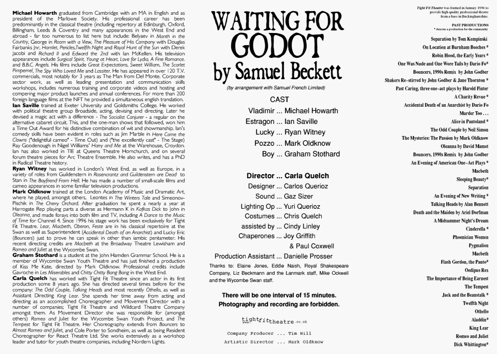 Vladimir and Estragon are waiting. They talk, play games, argue. A stranger enters, Pozzo, leading Lucky on a rope. They talk. Nothing appears to happen, nothing appears to change. But in these moments the world moves on. We either move with it, or sit on a lonely country road and wait.